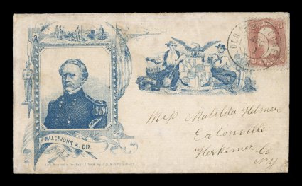 1058 c 65 image#65, 3c Rose, tied to ornate design of General Dix in blue with Hunckel & Son imprint by "Old Point Comfort/Va/Aug 1" double-circle c.d.s., trace of soiling and minor corner repair at bottom right , very fine and rare design; ex-Bleuler. (Image) Est. $300-400