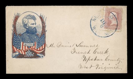 1059 c 65 image#65, 3c Rose, tied to attractive patriotic cover of General Milroy by blue "New Creek Station/W. Va/Dec 8" double circle c.d.s., posted to French Creek, West Virginia, appropriately used in West Virginia as this is where this Indiana general served and became known as the "Gray Eagle of the Army", trace of perf. toning to the stamp, very fine and rare patriotic cover; ex-Bleuler. (Image) Est. $200-300