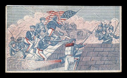 1060 c 65 image#65, 3c Rose, lovely allover front battle scene in red, white and blue showing soldiers storming ramparts, J.W. Bond & Co. imprint, on the reverse an early printing of a 3c Rose implying an 1861 usage tied by blue "Baltimore/Md./Oct 17" c.d.s., posted to Ipswich, Mass., closed tear in backflap not affecting stamp or markings, very fine; most interesting and attractive design, the uniforms and figures suggest that this was an illustration from the earlier Mexican War that was pressed into service for the Civil War; ex-Bleuler. (Image) Est. $400-500