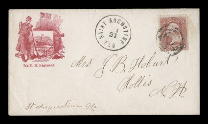 1061 c 65 image#65, 3c Rose, tied to choice regimental patriotic cover for the 7th N.H. Regiment in red by black target with clear Saint Augustine, Florida c.d.s. at left, posted to Hollis, N.H., very fine and choice patriotic from Union occupied territory; ex-Bleuler. (Image) Est. $150-200