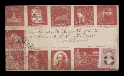 1062 c 65 image#65, 3c Rose, on ten-view House that Uncle Sam Built caricature patriotic cover, James Gates imprint on the reverse, posted to a Lieutenant at St. Louis, Mo. with "Versailles/Ind./Nov 28" c.d.s., stamp with matching central cut cork cancel (natural s.e at left), small corner repair at top left and light edge staining, fine and extremely rare; it is reported that only three examples of this patriotic design are recorded used; ex-Bleuler. (Image) Est. $500-750