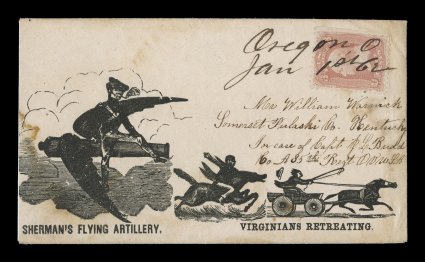 1063 c 65 image#65, 3c Rose, tied to handsome and scarce caricature patriotic showing a soldier riding a winged cannon captioned "Sherman's Flying Artillery" and showing "Virginians Retreating", stamp tied by ms. "Oregon, O/Jan 1st 62" two line pmk., posted to a soldier in Sumerset, Kentucky, minor stains to cover, very fine and extremely rare design; ex-Walcott, Bleuler. (Image) Est. $300-400