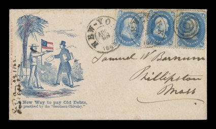 1064 c 63 image#63, 1c Blue, three singles tied to caricature patriotic cover showing a southerner holding a gun to a bill collector inscribed "A new way to pay old debts/as practiced by the 'Southern Chivalry'", stamps tied by "New York/Aug 28 1862" duplex, to Phillipston, Mass, soiling to perfs. at top, very fine and scarce with the 1c value ex-Bischel, Bleuler. (Image) Est. $200-300