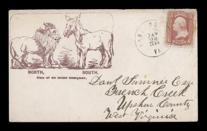 1065 c 65 image#65, 3c Rose, tied to caricature patriotic cover by "Parkersburg/Va/Jan 24, 1863", a town that was to be in West Virginia five months later when admitted to the Union on June 20, 1863, to French Creek, another West Virginia town, a most appropriate patriotic with the Lion of the North and the Donkey of the South facing off and inscribed "One of us Must Conquer", well illustrating the struggle that was going on in Virginia, trace of perf. toning to stamp, very fine and scarce patriotic design; ex-Bleuler. (Image) Est. $200-300