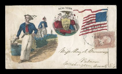 1066 c 65 image#65, 3c Rose (perf. flaws), tied to Charles Magnus hand colored design showing a Sailor and Mounted Dragoon at left, State Seal of New York in the center and Flag at right, stamp tied by "Washington/D.C./Sep 10 1861" c.d.s., slight soiling at bottom left and left backflap replaced, fine and rare three-part Magnus design; ex-Bleuler. (Image) Est. $400-500