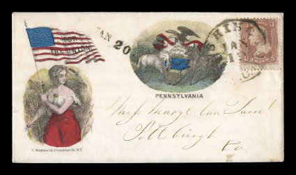 1067 c 65 image#65, 3c Rose, tied to attractive two-part Charles Magnus multicolor design with a Female figure holding Flag at left and Pennsylvania Coat of Arms at right, Magnus imprint below left design, stamp tied by "Washington/D.C./Jan 19" c.d.s., posted to Pittsburgh, Pa where it was advertised the next day with a "Jan 20" handstamp, on the reverse "Not/Called/For" handstamp and Pittsburgh c.d.s., very fine; a fresh and attractive Magnus cover; 1980 PF certificate; ex-Bleuler. (Image) Est. $400-500