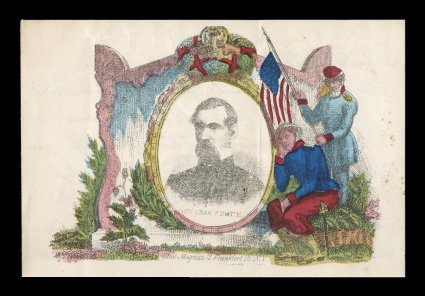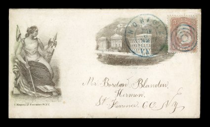 1068 c 65 image#65, 3c Rose, tied to two-part Charles Magnus patriotic in bronze with Seated Female at left and the U.S. Patent Office at right, stamp tied by blue "Norfolk/Va/Nov 6 63" duplex, posted to Herman, N.Y., includes enclosure datelined Fort Kingsferry with large handpainted Magnus design of General Charles H. Smith in an ornate frame, both the cover and the enclosure with Magnus imprints, very fine; a very attractive and rare pair; ex-Bleuler. (imagea) (Image) Est. $500-750