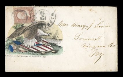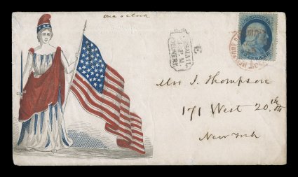 1069 c 24 image#24, 1c Blue, Ty. V, tied to seldom seen Liberty with Sword and Waving Flag in red, white and blue with embossed imprint of Francis & Loutrel, stationers and printers of New York, stamp tied by red carrier c.d.s. of New York, with "E/U.S. Mail/4 P.M./Delivery" black handstamp at left, ms. "one o'clock" at top, apparently when posted and delivered the same day, couple of trivial edge tears to cover not affecting any important elements of this attractive cover, very fine; an early patriotic cover with scarcer franking; ex-Bleuler. (Image) Est. $200-300