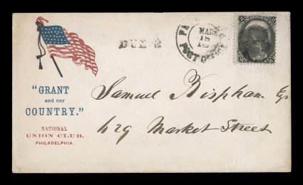 1072 c 87 image#87, 2c Black, "E" grill, tied to combination patriotic/campaign cover of Ulysses S. Grant with Flag design and inscribed "Grant and our Country" on envelope of the National Union Club, Philadelphia, stamp tied by "Philadelphia/Post Office/Mar 18" duplex, "Due 2" handstamp at left, posted within the city, very fine cover and unusual usage; ex-Bleuler. (Image) Est. $200-300
