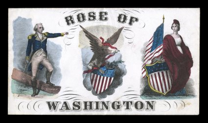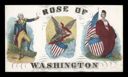 1073 ogc imageRose of Washington unused patriotic cover with Rose enclosure, a magnificent handpainted three part design of Charles Magnus, fresh and crisp with bright colors on a nice white envelope, includes the foldout Rose enclosure showing numerous scenes and monuments of Washington, D.C., printed in blue on the outside and in bronze on the inside, with Magnus imprint on the enclosure, extremely fine; there are actually several types of both the cover and the enclosure, this cover is in a different design than the used example and other unused example that are offered here, the printed portions of the three designs have different shading and the three figures are actually different, Washington's face having what looks like scowl on it; an extraordinarily difficult patriotic to find with enclosure in this premium condition; ex-Bleuler. (imagea) (Image) Est. $400-500