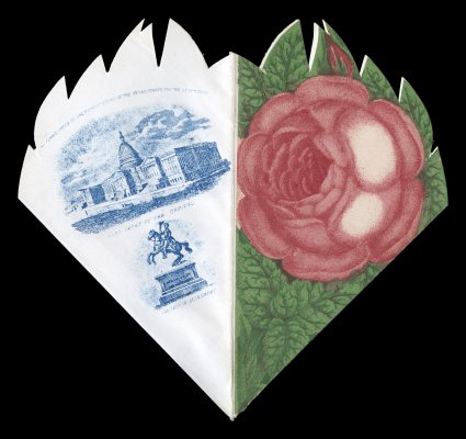 1074 ogc imageRose of Washington unused patriotic cover with Rose enclosure, another example of this impressive handpainted three part design of Charles Magnus which is very similar, but different, from the previous unused cover with different shading and expressions on the faces of the two figures, the foldout Rose enclosure shows the same numerous scenes and monuments of Washington, D.C. but is reversed being printed in bronze on the outside and blue on the inside, with Magnus imprint on the enclosure, cover has mild vertical fold that is barely detectable from the front, very fine; ex-Bleuler. (imagea) (Image) Est. $300-400