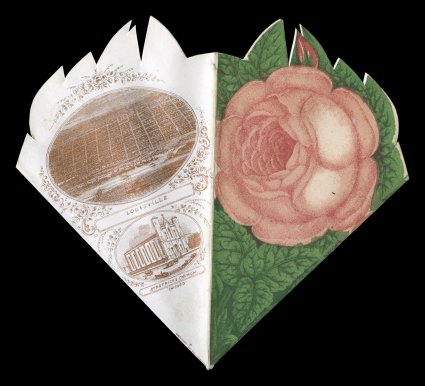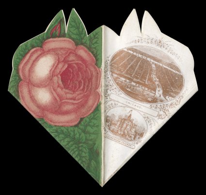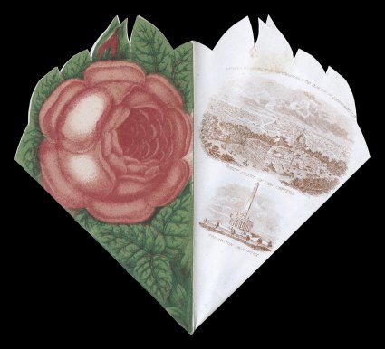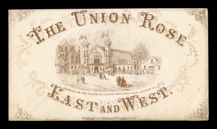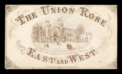 1075 ogc imageThe Union Rose/East and West an attractive Charles Magnus envelope in bronze for the North Western Sanitary Fair showing the building of the Fair in Chicago, includes the rose type foldout enclosure, similar to the Rose of Washington only the views depicted are of major cities around the country from the east to the mid-west portions of the country, all views on both the inside and outside are in bronze, only a trace of aging to the cover, very fine and handsome; ex-Bleuler. (imagea) (Image) Est. $300-400