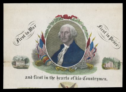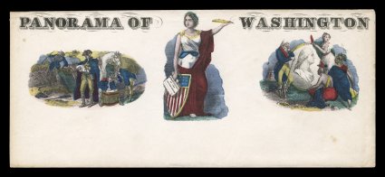1077 ogc imagePanorama of Washington unused patriotic cover with large foldout enclosure, a gorgeous handpainted three part design of Charles Magnus on legal size cover, this size is extremely rare and necessary to hold the oversize enclosure which measures nine inches wide and an amazing 29 1/2 inches long, "Panorama of Washington" is somewhat a play on words for Washington, the man, and the city of Washington, D.C., the cover features Washington, the man, while the enclosure has a large portrait of President Washington (after Stewart) at top, then 26 separate illustrations of buildings and monuments in Washington with a final large panoramic view of the Capitol building at bottom, all are hand colored in the style of Charles Magnus, the cover is exceptionally attractive with a minimal amount of aging, most on the reverse, enclosure is obviously folded but has some addition horizontal folds and slight wear as would be expected, overall very fine; an impressive and extremely rare Magnus patriotic production; ex-Bleuler. (imagea) (Image) Est. $400-500