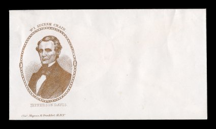 1078 ogc imageCharles Magnus unused patriotic cover series of 24 different numbered portraits of CSA Officials and Generals entitled "Secesh Chain" starting with President Jefferson Davis and Vice President Alexander Stephens, then 22 different portraits of military officers, mostly generals, all printed in bronze and actually complete thus, this rare series actually consists of 30 covers, but when it was printed in bronze ink only 24 designs were printed, all are fresh and attractive, two small spots of adherence on the reverse where mounted, very fine and choice; an exceptionally rare series that is seldom available in its entirety; ex-Bleuler. (Image) Est. $400-500