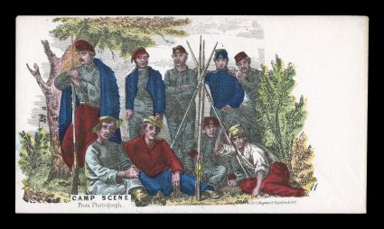 1080 ogc imageCharles Magnus multicolor unused Camp Scene patriotic cover series of 20 different numbered views of soldiers relaxing in camp, the lithographs were taken from photographs and have beautiful hand applied colors that this publisher is so famous for, all with Magnus imprint, exceptionally fresh and attractive on bright white envelopes, choice very fine and quite rare as a complete set; ex-Bleuler. (Image) Est. $400-500