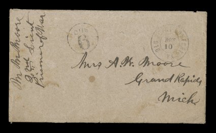 1121 c imageLibby Prison, prisoner of war cover, brownish paper envelope out of this prison in Richmond, Va. to Grand Rapids, Michigan, with "M.M. Moore/2nd Lieut./Prisoner of War" endorsement at left, "Old Point Comfort/Va./Nov 10" c.d.s. where the cover crossed the lines from South to North, "Due 6" in circle handstamp, no Confederate postage was necessary on this P.O.W. usage, enclosure date lined "Libby Prison/Feb. 14th/'64" to his mother, as addressed on the cover (the discrepancy in date may indicate is an earlier letter but clearly establishes the prison which is very difficult with Confederate prisons), he notes that he is only allowed to write six lines (so he writes lengthwise on the letter sheet) and states that he expects to remain there the rest of the war, minor edge wear to cover, actually quite nice and fine-very fine; a rare letter from a Union prisoner in this Confederate prison; ex-Bleuler. (Image) Est. $500-750