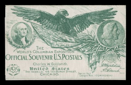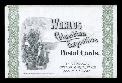 1131 ogc EX62-73 imageUPSS #EX62-73, Columbian Exposition postal cards, set #7a cplt. produced by Girsch and Roehsler, set of twelve cards in black, all matching in the type "a" measurements, and including the wrapper in green and black without a printed price (with usual folds and slightly reduced at bottom, not affecting any important elements of the design), cards are crisp with mostly sharp edges, some show slight aging typical of these uncoated cards and the Agricultural Building card has a couple of small stains, very fine and very scarce, especially including a wrapper; ex-Bleuler. (Image) UPSS $750.00