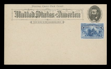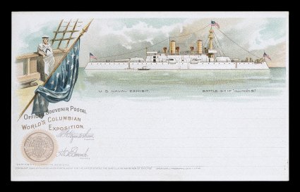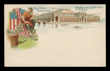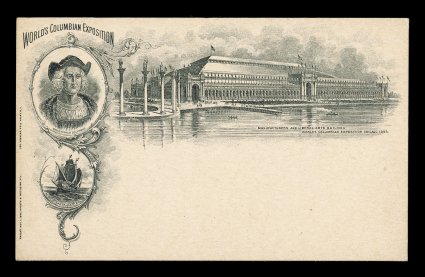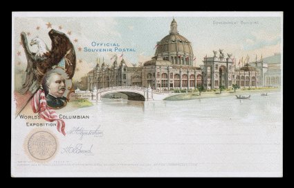 1135 ogOc EX15/79 UPSS #EX15/79, Large Columbian Exposition postal card accumulation, consisting of over 150 special cards prepared for the exposition with views printed on 1c Grant postal cards, largely official cards produced by Goldsmith plus a few others, over 125 are mint and are largely in full sets of from two to twelve cards in a set, we note three sets of ten of each of set #2 and #5, two sets of the cut down cards and one with additional 1c Columbian values added for foreign mail (sets #3,4), over 20 used include cards from various sets including thirteen with World's Fair station cancels, four with extra Columbian values for foreign mail plus other interesting usages, mint cards are fresh and attractive with nearly all being fine-very fine or better, the used are a little more mixed, as would be expected, but generally fine-very fine as well with a few exceptions; a nice hoard of these attractive cards that are seldom found any more; ex-Bleuler. Est. $1,500-2,000