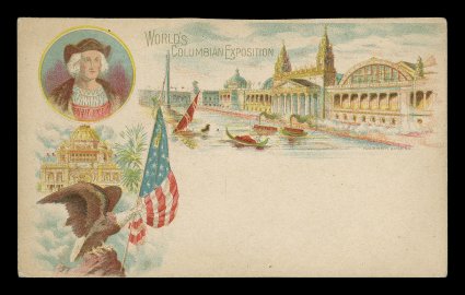 1133 ogc EX76-77 imageUPSS #EX76-77, Columbian Exposition postal cards, set #9 cplt. consisting of two multicolor uncoated cards of an unknown publisher, exceptionally fresh and attractive, extremely fine; ex-Bleuler. (Image) UPSS $300.00