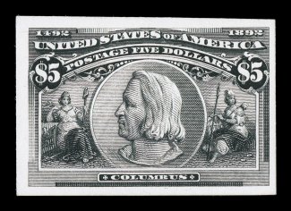 102 P 230P4-45P4 image#230P4-45P4, 1c-$5.00 Columbians, plate proofs on card cplt., an attractive set, all with large even margins, colors are rich and deep, this shows particularly in the dollar values such as the $1.00 Salmon and $4.00 Crimson lake, which often come weak, h.r. which may obscure an occasional light thin speck, very fine; ex-Bleuler. (Image) $1,345.00