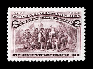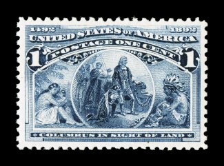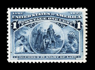 104 nhu 230 image#230, 1c Columbian, pristine mint example, outstanding centering within wide margins, deep rich color and a crisp impression on immaculate paper, o.g., n.h., extremely fine; 2007 PSE certificate (XF 90; SMQ $205.00). (Image) $57.50