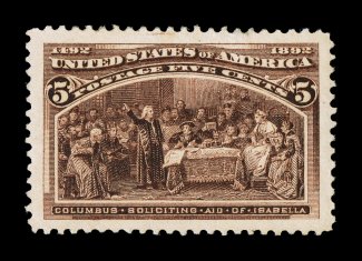 108 ogu 234 image#234, 5c Columbian, a spectacular mint single that possesses truly immense margins, the likes of which we have never seen on this stamp, plus it is incredibly well centered within these gigantic borders, intensely rich color and a highly detailed impression, full o.g. that is slightly disturbed, extremely fine; an amazingly large stamp; 2007 PSE certificate (Superb 98 Jumbo; SMQ $670.00 for 98); this highest grade the PSE has given to a Five Cent Columbian. (Image) $95.00