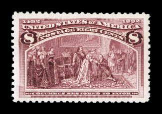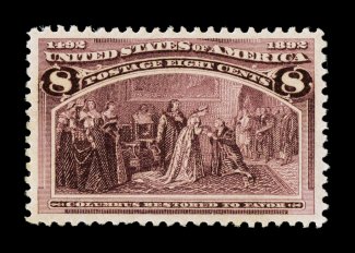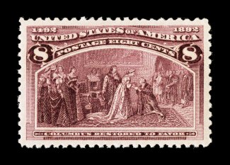 110 ogu 236 image#236, 8c Columbian, a stunning mint single that possesses exceedingly large and perfectly balanced margins all around, rich vibrant color and a well defined impression, o.g., lightly hinged, superb; a truly gem example; 2007 PSE certificate (Superb 98 Jumbo; SMQ $580.00 for 98); this is the highest grade the PSE has assigned to this stamp and the only example to achieve Superb 98J status. (Image) $80.00