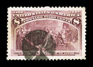 113 Ou 236 image#236, 8c Columbian, an amazing used single that possesses that most gigantic margins we have ever seen on any Columbian issue, and remarkably, it is perfectly centered within these breathtaking borders, strong rich color and impression, quartered-cork cancel, current certificate mentions a shorter perf. at right and natural paper inclusion at top right, neither of which are distracting but it may help explain the unexpectedly low grade the PSE has assigned to this gem, a superb stamp of record proportions; clear 1993 PSE certificate and a 2007 PSE certificate (XF 90 Jumbo; SMQ $60.00 for 90 and $210.00 for 98). (Image) $11.00