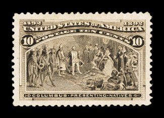 114 ogu 237 image#237, 10c Columbian, a stunning mammoth-margined mint example, possessing the largest borders we have ever seen on this value, and incredibly, it is perfectly centered within these boardwalk margins, plus it has been printed in the striking black brown shade which is quite intense, o.g., lightly hinged., extremely fine; an unbelievable stamp; 1995 PF certificate and a 2007 PSE certificate (XF-Superb 95 Jumbo; SMQ $440.00 for 95 and $920.00 for 98). (Image) $150.00