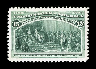 115 ogu 238 image#238, 15c Columbian, an impressively large-margined mint example that is wonderfully well centered within extravagantly large margins which are rarely encountered on this value, brilliantly rich color and a well defined impression on pristine white paper, o.g., lightly hinged, extremely fine gem; 1988 PF certificate and a 2007 PSE certificate (XF-Superb 95 Jumbo; SMQ $760.00 for 95 and $1,550.00 for 98). (Image) $250.00