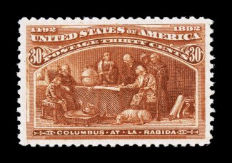 116 nhu 239 image#239, 30c Columbian, an extraordinarily choice mint example, being impeccably well centered amid extravagantly large margins, gorgeous rich color and a deeply etched impression, pristine o.g., n.h., extremely fine; a highly desirable Thirty Cent Columbian in truly gem quality; 1987 and 2003 PF certificates, as well as a 2006 PSE certificate (XF-Superb 95; SMQ $7,250.00). (Image) $900.00