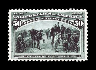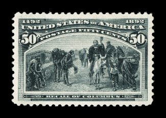 117 nh 240 image#240, 50c Columbian, an especially choice mint single, possessing a remarkable brilliance few others enjoy, with stunning color that is especially deep and intense, prooflike impression on fresh untoned paper, additionally it is marvelously well centered amid uncharacteristically wide margins, unblemished o.g., n.h., extremely fine; a terribly difficult stamp to find in this outstanding never hinged condition; 2000 and 2007 PF certificates. (Image) $1,750.00