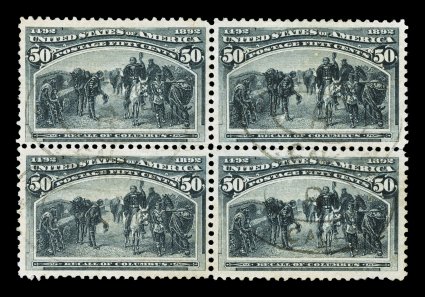 119 Obl 240 image#240, 50c Columbian, used block of four, exceptionally well centered overall and each stamp is attractively centered as well, strong color and sharp impression, very lightly cancelled with San Francisco registry ovals, small light diagonal grease at top left of the top left stamp, otherwise very fine; a difficult value to find in a used block; 2005 PF certificate. (Image) $1,100.00