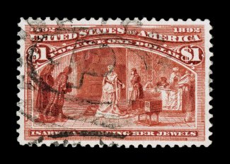 120 Ou 241 image#241, $1.00 Columbian, a used example that possesses tremendous eye appeal, being incredibly well centered amid extravagantly large margins, and even more impressive is this stamp's spectacular "fiery" color in an unusually deep shade, plus its impression is well incised on bright paper, neat strike of a double oval registry cancel, extremely fine gem; 1987 and 2002 PF certificates, as well as a 2004 PSE certificate (XF 90; SMQ $1,350.00); ex-Hinrichs. (Image) $650.00