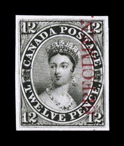 1281 P 3Pi image#3Pi, 12p Black, plate proof on India, with carmine "SPECIMEN" overprint reading vertically, with full original card backing, large even margins all around, strong impression, a very fine example of this rare proof. (Image) Unitrade C$2,000.00