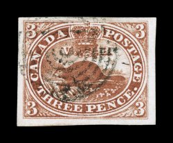 1282 O 4a image#4a, 1853 3p Brown red on medium wove, attractive used single with four large margins, color is especially deep in the desirable brown red shade, neat black target cancel, extremely fine and exceedingly choice; 2005 Greene Foundation certificate (Unitrade C$350.00). (Image) $225.00