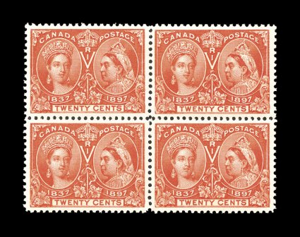 1285 ogbl 59 image#59, 1897 20c Jubilee, a beautiful mint block of four, with near perfect centering throughout, gorgeous radiant color, o.g., just a faint trace of hinging in the center of the block, extremely fine; 2006 PF certificate (Unitrade C$1,200.00+) (Image) $800.00+