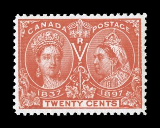 1286 nh Unitrade #59i imageUnitrade #59i, 1897 20c Jubilee in the deep vermilion shade, "post office" fresh mint single, exceptionally well centered and margined, gorgeous radiant color and an outstanding impression, pristine o.g., never hinged, extremely fine; 1995 Greene Foundation certificate (Scott $500.00 for normal vermilion shade). (Image) Unitrade C$975.00