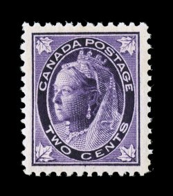 1288 nh 68 image#68, 1897 2c Purple "Maple Leaf", an exceedingly select quality mint single possessing mathematically precise centering amid unusually large margins, wonderfully fresh with strikingly deep and vibrant color, immaculate o.g., n.h., extremely fine (Unitrade C$135.00). (Image) $70.00