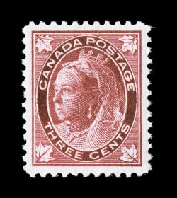 1289 nh 69 image#69, 1898 3c Carmine "Maple Leaf", lovely mint single being exceedingly well centered and margined, particularly deep luxuriant color and a prooflike impression, pristine o.g., n.h., extremely fine (Unitrade C$180.00). (Image) $100.00