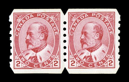 1295 og Unitrade #90xxxv imageUnitrade #90xxxv, 1903 2c Carmine, experimental coil, Type III, an amazingly well centered pair with U. S. Automatic Vending Machine perforations, fresh bright color and detailed impression, o.g., lightly hinged, extremely fine; the 2c Edward VII issue was perforated in the three different types of perforations of this vending machine company as an experiment, extremely rare, especially in this choice quality; Unitrade price is specifically for fine-very fine; 1992 PF certificate. (Image) Unitrade C$1,250.00