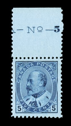 1296 nh 91 image#91, 1903 5c Blue on bluish, "post office" fresh top sheet-margin single showing portions of the imprint and plate number, extraordinarily well centered within very large margins, rich fresh color and a highly detailed impression, o.g., n.h., extremely fine; an exceedingly choice example of this attractive value (Unitrade C$900.00). (Image) $450.00