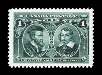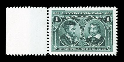 1299 nh Unitrade #97i imageUnitrade #97i, 1908 1c Tercentenary, hairlines in margins variety, remarkably choice left sheet-margin mint single, outstanding centering within extraordinarily large and exceedingly well balanced margins all around, amazingly deep vibrant color on fresh paper, immaculate o.g., n.h., extremely fine; a large-margined gem that shows the hairlines in all four margins (Scott for normal $35.00). (Image) Unitrade C$120.00