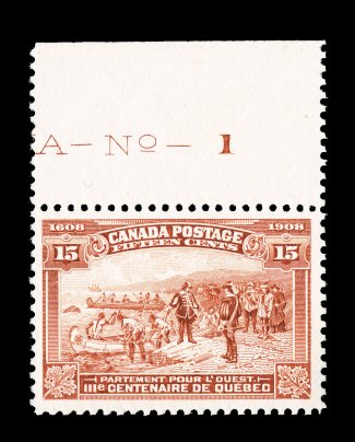 1300 nh 102 image#102, 1908 15c Tercentenary, top sheet-margin plate no. 1 single, exceptionally well centered within large margins, brilliant color, unblemished o.g., n.h., very fine and exceedingly choice (Unitrade C$750.00). (Image) $450.00