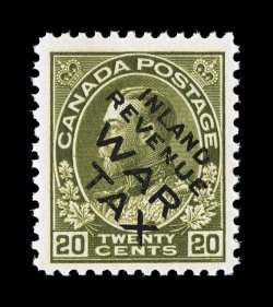 1321 nh Unitrade #MR2Ci imageUnitrade #MR2Ci, 1915 20c Olive green with "Inland/Revenue/War/Tax" overprint, exceptionally fresh mint single of this undervalued stamp, sumptuously rich color and an intense impression, o.g., n.h., very fine; actually scarcer than its counterpart without the "Inland/Revenue" overprint, especially never hinged. (Image) Unitrade C$180.00