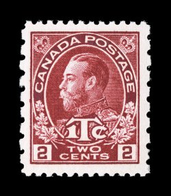 1322 nh MR5 image#MR5, 1916 2c + 1c Carmine war tax stamp, die I, perf. 12x8, remarkably well centered within large and balanced margins, radiant color, o.g., n.h., extremely fine; actually this combination perforation is a very difficult stamp to find in this gem quality(Unitrade C$150.00). (Image) $120.00