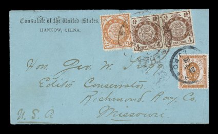 1323 c 88, 89 image#88, 89, 1897 2c Orange and 4c Brown (2x), on imprinted "Consulate of the United States/Hankow, China" cover with consulate handstamp of March 18, 1898 on the reverse, posted to the United States with stamps tied by brown Hankow bilingual "dollar chop", similar Shanghai c.d.s. on the reverse, a dual franking cover that was turned over to the Japanese post office in Shanghai with Japan 10s Brown orange (Scott #79) tied by "Shanghai/I.J.P.O/24 Mar 98" c.d.s., Yokohama and San Francisco transits, backstamped Richmond, Missouri, small piece of backflap added not affecting any of the numerous markings, very fine; ex-Bleuler. (Image) Est. $400-500