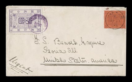 1324 c Ichang #3 imageIchang #3, 2c Red violet tied to 1895 cover to the United States, by violet "Ichang/Post Office" bilingual circular handstamp with additional strike on the reverse and boxed "Ichang/19 Jul 95" bilingual handstamp on the reverse, in mixed franking with Hong Kong 10c Violet on red (Scott #44) tied by "Hankow/JY 23 95" c.d.s., endorsed on the reverse "H.B.M. Consulate/Ichang, China" of the British consulate there, British Shanghai transit, backstamped Peoria, Ill., trivial edge tear in opening at top right not affecting stamps or marking, very fine; a rare treaty port posting of Hong Kong in combination with this scarce Chinese treaty port local; ex-Bleuler. (Image) Est. $1,000-1,500