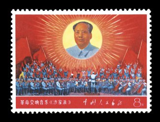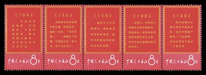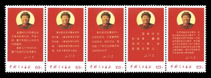 1329 nh 996a image#996a, 1968 8f Directives of Mao, strip of five, exceptionally bright and fresh, o.g., n.h., lightly folded between second and third stamps, fourth stamp with tiny spot on gum mentioned only for accuracy, very fine. (Image) $1,900.00