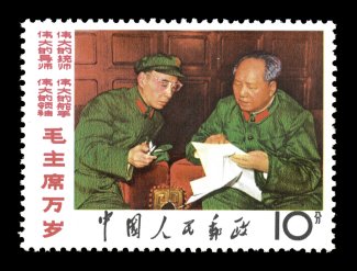 1325 nh 938-948a image#938, 943a, 948a, 1967 8f Thought of Mao cplt., with the single #938 and two strips of five, o.g., n.h., first strip has been slightly folded between the third and fourth stamps, the other strip has the color somewhat tarnished, otherwise fine-very fine. (Image) $1,980.00